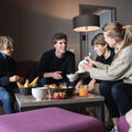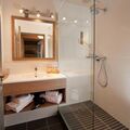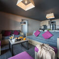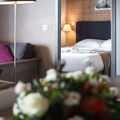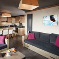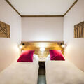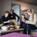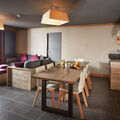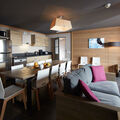 "CGH Rés&Spa Chalets du Soleil (C) 4*", 5-room apartment 85 m2. Modern and stylish furnishings: living/sleeping room with 1 sofabed, 1 pull-out bed, dining table and satellite TV. Exit to the balcony. 3 rooms, each room with 1 french bed. 1 room with 2 beds. Kitchenette (oven, dishwasher, 2 ceramic glass hob hotplates, toaster, kettle, microwave, electric coffee machine, steamer). 2 sep. WC's, 3 baths or showers. Heating. Balcony. Balcony furniture. Facilities: telephone, hair dryer. Internet (WiFi, free). Please note: non-smokers only. Maximum 1 pet/ dog allowed. Smoke alarm, fire extinguisher.