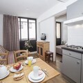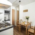 This spacious apartment is perfect for families or groups, with accommodations for up to six guests. It features a living room with two beds and a cabin with two bunk beds, plus a mezzanine with additional sleeping arrangements, offering flexibility for various group sizes. Pets are welcome for an additional fee, making it a great option for those traveling with furry friends. The apartment includes Wi-Fi access (available for a fee), and bed linens are provided. A final cleaning package is included, though guests are responsible for cleaning the kitchen and dishes.