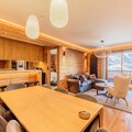 Spanning 86 square meters, the apartment boasts three chalet-style bedrooms, including two with en-suite shower rooms, and an additional bathroom. The open-plan living area, complete with a fully equipped kitchen and cozy lounge, is perfect for unwinding after a day on the slopes. Modern amenities such as satellite TV, Wi-Fi, and a ski locker with boot dryers ensure a seamless stay. The property also includes a garage space and offers thoughtful touches like beds made upon arrival, towels, and end-of-stay cleaning.