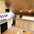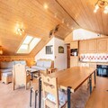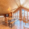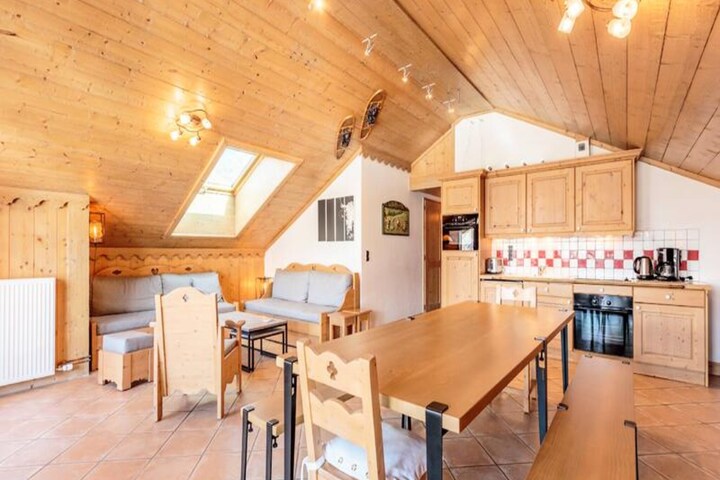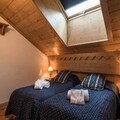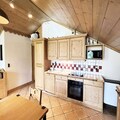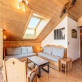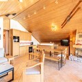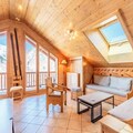 Spanning 106 m², this spacious apartment accommodates up to eight guests, making it perfect for families or groups of friends. The warm, chalet-style interiors feature three cozy bedrooms, including a master suite with an en-suite shower room, and a bunk room ideal for children. The open-plan kitchen is fully equipped for culinary adventures, while the inviting living room, complete with a TV and balcony access, provides the perfect space to unwind after a day on the slopes. Additional amenities include ski lockers with boot dryers, two garage spaces, and complimentary Wi-Fi.