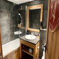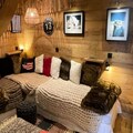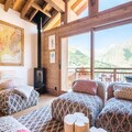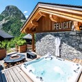 Chalet Felicita seamlessly blends modern luxury with cozy mountain ambiance. The ground floor features a spacious living room with a wood-burning stove and a west-facing balcony, perfect for soaking in the golden hues of the setting sun. The open-plan kitchen is fully equipped with high-end appliances, while the beautiful terrace boasts a private jacuzzi and a large fire pit, ideal for unwinding after a day on the slopes. The lower level includes a TV lounge for relaxed evenings, and the sleeping arrangements cater to up to six guests, including a master bedroom with an en suite bathroom, a double bedroom, and a bunk room with a desk area.
