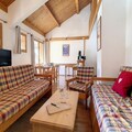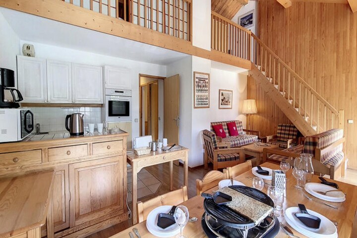 High above the charming village center, this spacious duplex apartment offers a perfect blend of alpine comfort and convenience. Imagine waking up to the warm glow of the sun on your southwest-facing balcony, with breathtaking views of the surrounding peaks. Whether you're here for winter skiing adventures or summer mountain escapes, this property is your gateway to unforgettable moments in the heart of the French Alps. The HORS PISTE residence is ideally located, just steps away from local shops, bakeries, and essential services, making it easy to immerse yourself in the vibrant village atmosphere. \n\nSpanning 83m², this 4-room apartment comfortably accommodates up to eight guests. The thoughtfully designed layout includes a suite with a double bed and private bathroom, a cozy bedroom with bunk beds, an open mezzanine with two single beds, and an additional bedroom with twin beds. The living room invites relaxation with a television and integrated DVD player, while the fully equipped kitchen ensures effortless meal preparation with modern appliances like a ceramic hob, oven, microwave, and dishwasher. Additional amenities include a separate toilet, a bathroom with a shower, and a ski locker for winter stays.\n\nThe residence offers direct access to the ski lift, making it a dream for ski enthusiasts. In summer, explore scenic hiking trails, cycling routes, and the natural beauty of the surrounding mountains. With two covered parking spaces included, you can easily venture to nearby attractions or simply enjoy the convenience of being in the village center. \n\nWhether you're seeking thrilling slopes or peaceful alpine vistas, this property delivers an exceptional holiday experience. Create lasting memories in a setting that combines rustic charm with modern comfort, all framed by the majestic beauty of the French Alps.