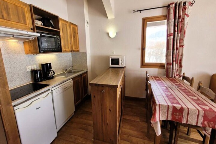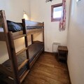 The apartment sleeps up to six guests, with a double bedroom, a smaller room with bunk beds, and a double sofa bed in the living room. Amenities include a fully equipped kitchen with modern appliances, a cozy lounge with a flat-screen TV, and Wi-Fi access. The bathroom features a bathtub and sink, with a separate WC. Ski lockers are conveniently located at the entrance, while underground parking is available for an additional fee. Please note that pets are not allowed, and the property is not accessible to those with reduced mobility.