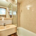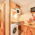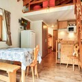 This cozy 2-room mezzanine apartment comfortably accommodates up to six guests, making it ideal for families or small groups. The thoughtfully designed interior features a bedroom with a double bed, a mezzanine with a double sofa bed, and bunk beds in the entrance hall. The living area includes a fully equipped kitchen with modern appliances such as an oven, microwave, refrigerator, dishwasher, and washer/dryer, ensuring all the comforts of home. After a day of adventure, unwind in the inviting lounge area with a television and free Wi-Fi, or relax in the bathroom with a bathtub and heated towel rail.