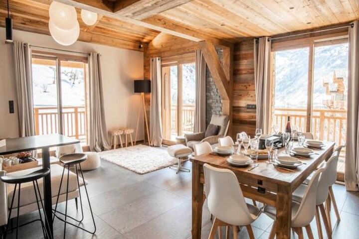 In the heart of the picturesque Bonneval-sur-Arc, one of France's most beautiful alpine villages, Le Génépi offers an unparalleled retreat for mountain enthusiasts and luxury seekers alike. Set at an altitude of 1800m, this exquisite duplex apartment combines modern elegance with alpine charm, all while being perfectly situated at the foot of the Le Vallonet chairlift for ultimate ski-in, ski-out convenience. From its expansive 40m² circular balcony, soak in breathtaking views of the slopes, valley, and village, bathed in sunlight thanks to its south/west orientation. Whether you're here for winter sports or summer hikes, the scenery is simply unforgettable.