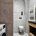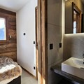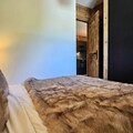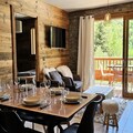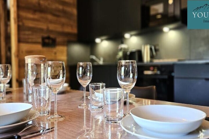 The modern kitchen is fully equipped with a dishwasher, large fridge, oven, coffee maker, kettle, and toaster, providing everything needed for cooking meals. The apartment also features a shower room with WC, and the living room is equipped with a TV. Additional amenities include a ski locker with a boot dryer and a covered parking space. Sheets, towels, and Wi-Fi are available for an extra charge.