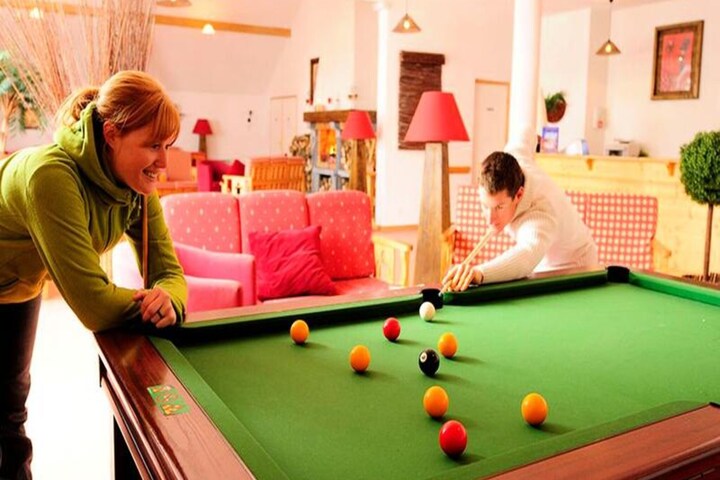 The residence comprises 20 three-story chalets, each divided into six cozy apartments. Inside, you’ll find a warm and inviting living space with a pull-out sofa bed, a fully equipped kitchen, a small bedroom with bunk beds, and a master bedroom with a double bed. Many apartments feature balconies or terraces, perfect for soaking in the crisp mountain air. Guests can also enjoy the heated outdoor swimming pool, open during the summer season, and a variety of on-site amenities like table tennis.