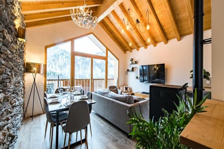 In the charming heart of the French Alps, Chalet Dente offers a serene mountain escape with modern comforts and breathtaking views. Situated on the picturesque Plan du Moulin road, this chalet is just 500 meters from the beginner slopes and the Plan du Moulin Express chairlift, making it an ideal retreat for skiers and nature lovers alike. With its south-facing orientation, the chalet is bathed in natural light, offering stunning vistas of the surrounding peaks and slopes from every angle.