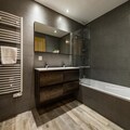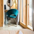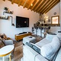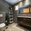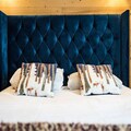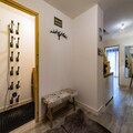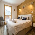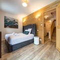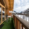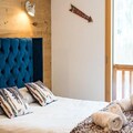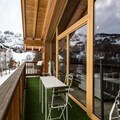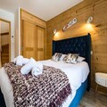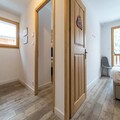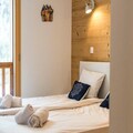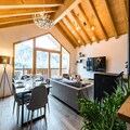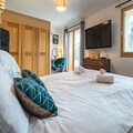 Spread across three floors, Chalet Dente combines traditional alpine charm with contemporary amenities. The top floor features a spacious and bright living area under the eaves, complete with a cozy TV lounge, a dining space, and a fully equipped kitchen. Step out onto the south-facing furnished balcony to soak in the crisp mountain air and panoramic views. The first floor houses two inviting bedrooms, one with a double bed and the other with two single beds, both equipped with ample storage. A shared bathroom with a toilet completes this level. On the ground floor, the luxurious master bedroom spans the entire width of the chalet, boasting a king-size bed, a flat-screen TV, and a desk/vanity area. This floor also includes a large bathroom, a laundry room, and a spacious entrance hall leading to a ski room with boot dryers.