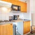 Inside, the open-plan electric kitchen includes a refrigerator, microwave, freezer, coffee machine, toaster, kettle, and all essential utensils. Additional amenities include a TV, hair dryer, electric heating, open-air parking in the adjoining building, and access to a heated communal swimming pool—ideal for unwinding after a day in the mountains.