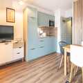 Inside, the induction kitchen is fully equipped with a refrigerator, microwave, freezer, dishwasher, coffee machine, toaster, kettle, and all essential utensils. Additional amenities include a TV, elevator access, open-air parking, and a heated communal swimming pool—ideal for relaxing after a day outdoors.
