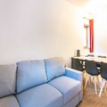 Kitchen(electric kettle, toaster, coffee machine, microwave, dishwasher, fridge, dishes and cutlery), Living/bed room(double sofa bed, bunk bed, TV, dining table, seating area), bedroom(double bed), bathroom(bath tub, washbasin, toilet), balcony, heating, swimming pool(shared with other guests)