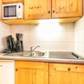 The apartment features a fully-equipped open-plan kitchen, complete with a refrigerator, microwave, dishwasher, coffee machine, toaster, and kettle, ensuring that guests can easily prepare meals. The kitchen is also stocked with dishes, cutlery, and kitchen utensils. Additionally, guests can enjoy access to a heated communal swimming pool, perfect for unwinding after a day on the slopes. A private balcony completes the space, offering a place to relax and enjoy the stunning mountain views.