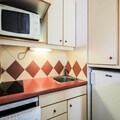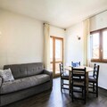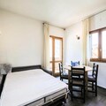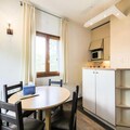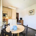 The studio features a living room with a sofa bed (sleeping 2), a sleeping area with bunk beds, a table with seating for four, and a kitchen open to the living room. The bathroom includes a bathtub or shower and a toilet. Bed linen is included; however, Wi-Fi access, towels, and end-of-stay cleaning are all available for an additional fee. Pets may also be allowed for an extra charge, but require inquiry with the residence. Parking is available nearby (municipal, covered for a fee, or free outdoor). A security deposit is required.