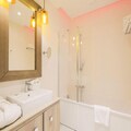 Inside the apartment, enjoy a well-equipped kitchen, two bathrooms (one with a bathtub and the other with a shower), and three separate toilets. The apartment also features a south-facing balcony with stunning views. On-site amenities include an indoor swimming pool, sauna, hammam, and outdoor hot tub, all available for guest use. Bed linens and towels are provided, and end-of-stay cleaning is included (excluding the kitchen area).