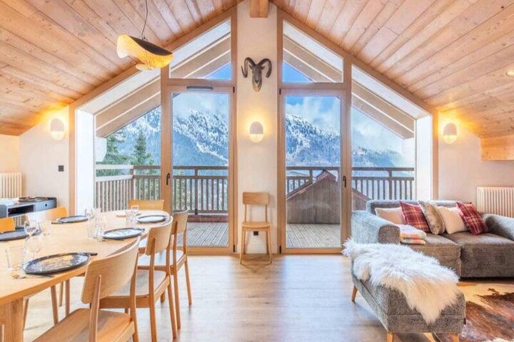 This brand-new apartment offers comfort and elegance with three spacious bedrooms and three well-appointed bathrooms, ideal for up to 8 guests. The master suite features a double bed, while the other two rooms include a set of bunk beds and two single beds. The apartment is pet-free, ensuring a peaceful stay. Sheets and towels are provided, and a refundable deposit of €500 is required. With a central location in Méribel's Morel district, the apartment offers easy access to the slopes, just 350 meters from the Doron blue slope and 280 meters from the Morel chairlift.