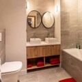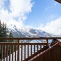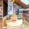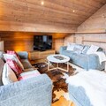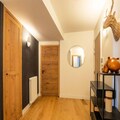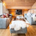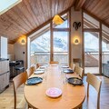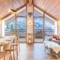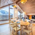 The open-plan living-dining area features a fully equipped kitchen, perfect for preparing meals. A large bay window opens to the terrace, offering stunning mountain views. The apartment has three bathrooms, including two with showers and one with a bathtub. The fully equipped kitchen ensures guests can cook with ease, while additional services such as ski pass delivery, ski equipment rental discounts, and catering can be arranged for a seamless stay.