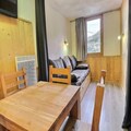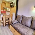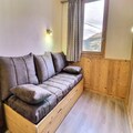 The studio, rated 3 stars and designed for up to four guests, offers a cozy and functional layout. The living area features a set of trundle beds, while a sliding wall separates a sleeping area with a comfortable double sofa bed. The kitchenette is fully equipped with modern appliances, including a combination microwave, ceramic hobs, a dishwasher, and more, making it easy to prepare delicious meals after a day on the slopes. The flat-screen TV and thoughtful amenities ensure a comfortable stay, while the east-facing orientation fills the space with natural light.