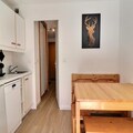 High above the bustling Chatelet shopping center, this charming studio apartment in the Olympie 1 residence offers a cozy alpine retreat for up to four guests. Imagine waking up to the crisp mountain air and stepping onto your west-facing balcony to take in the serene views of the slopes and surrounding peaks. Perfectly positioned just 100 meters from the main ski lift and 50 meters from the shuttle bus stop, this property ensures effortless access to the winter wonderland of the French Alps. Whether you're here for skiing adventures or summer hikes, the convenience and comfort of this location are unmatched. \n\nInside, the studio is thoughtfully designed to maximize space and comfort. The sleeping alcove features bunk beds, ideal for families or small groups, while the living room boasts a Rapido sofa bed for restful nights. A well-equipped kitchenette includes modern appliances such as a microwave with grill, refrigerator, dishwasher, and Nespresso coffee maker, making meal preparation a breeze. The bathroom is compact yet functional, and modern touches like a flat-screen TV and Bluetooth speaker ensure entertainment and relaxation after a day on the slopes. With a non-smoking policy and pet-friendly accommodations, this studio caters to diverse needs. \n\nStep outside and find yourself immersed in the vibrant atmosphere of Chatelet, with its convenient shops, dining options, and the ESF meeting point just moments away. Families will appreciate the proximity to the Piou-Piou kindergarten, while outdoor enthusiasts will love the easy access to ski lifts and shuttle buses. In summer, the area transforms into a haven for hikers and nature lovers, with trails leading to breathtaking vistas. \n\nWhether you're seeking thrilling alpine adventures or tranquil mountain escapes, this studio in Olympie 1 is the perfect base for creating unforgettable memories in the heart of the French Alps.