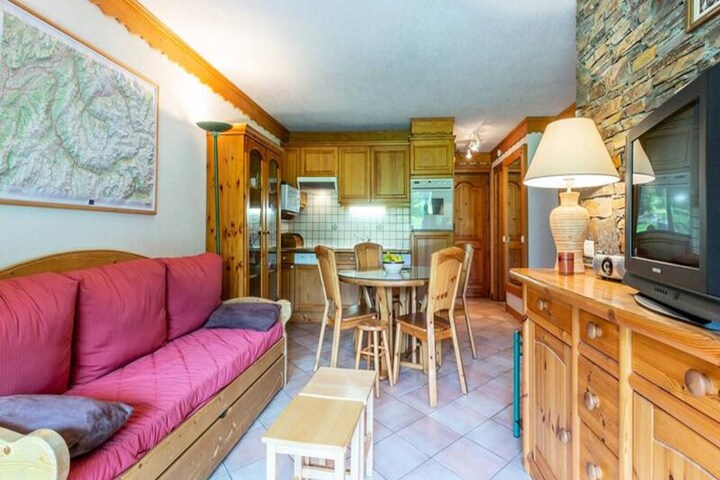 In the serene neighborhood of Le Chatelet in Méribel Mottaret, this charming ground-floor apartment offers a perfect blend of comfort and convenience for your alpine getaway. Surrounded by the majestic peaks of the French Alps and just a short walk from the slopes and ski lifts, it’s an ideal retreat for winter sports enthusiasts and nature lovers alike. The tranquil setting near Lake Tueda also provides a picturesque backdrop for snowshoeing, cross-country skiing, or leisurely walks. \n\nInside, the apartment is thoughtfully designed to accommodate up to six guests. The living room features a cozy sofa bed, a trundle bed, and a television, creating a welcoming space to unwind after a day of adventure. The bedroom includes a double bed and a cabin with bunk beds, perfect for families or groups. The open-plan kitchen is fully equipped with modern appliances, including a ceramic hob, oven, dishwasher, refrigerator, washing machine, microwave, toaster, kettle, and coffee maker, ensuring you have everything needed to prepare delicious meals. A bathroom with a separate toilet adds to the convenience, while the balcony offers a peaceful spot to enjoy the fresh mountain air. Additional amenities include a ski locker and optional services such as linens, towels, and end-of-stay cleaning.\n\nThe residence Les Alpages, a complex of five independent chalets, is one of the newest in Méribel Mottaret. Its quiet location and proximity to shops, just 150 to 400 meters away, make it a practical choice for your stay. Whether you’re here to carve through pristine slopes, explore the stunning trails around Lake Tueda, or simply relax in the serene alpine atmosphere, this apartment provides the perfect base for unforgettable memories in the heart of the Three Valleys ski area.