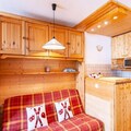The studio is thoughtfully designed to accommodate up to four guests, featuring two sofa beds and a double bed for flexible sleeping arrangements. The kitchen is fully equipped with modern amenities, including an induction hob, dishwasher, microwave, refrigerator, kettle, and coffee maker, ensuring you have everything needed for a comfortable stay. A bathroom with a separate toilet adds convenience, while the ski locker and elevator make your alpine experience seamless. Additional services such as linens, cleaning, and baby equipment can be reserved in advance, catering to all your needs.