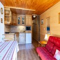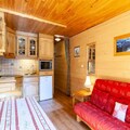 Inside, the apartment is thoughtfully designed for comfort and practicality. The living room features a cozy sofa bed and a television, opening onto a balcony where you can savor the crisp mountain air. The bedroom boasts a plush double bed for restful nights, while the kitchenette is fully equipped with modern appliances including a ceramic hob, dishwasher, combi oven, refrigerator, coffee maker, and kettle. A separate bathroom and toilet ensure convenience, and additional amenities such as a ski locker and elevator make your stay effortless. The apartment is non-smoking and pet-free, ensuring a clean and peaceful environment.