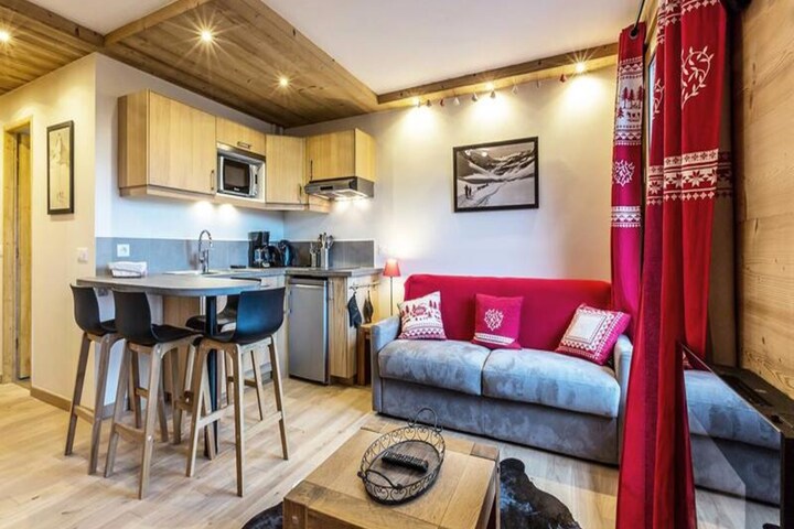 In the enchanting alpine village of Méribel Mottaret, this beautifully renovated apartment offers a perfect blend of modern comfort and mountain charm. Awarded the prestigious Méribel Label, this residence invites you to immerse yourself in the heart of the French Alps, where every detail has been designed for an unforgettable stay. From its prime location, you can step directly onto the slopes or explore the vibrant resort center just moments away. \n\nInside, the apartment boasts a cozy living room with a sofa bed and a set of bunk beds, ideal for families or small groups. The fully equipped kitchenette includes a stovetop, oven, dishwasher, refrigerator, toaster, kettle, and coffee maker, ensuring you have everything you need to prepare hearty meals after a day of alpine adventures. A separate bathroom and toilet provide added convenience, while the private balcony offers a serene spot to enjoy your morning coffee or evening views of the surrounding peaks. The apartment is non-smoking and includes a ski locker and elevator access for your convenience.\n\nMéribel Mottaret’s resort center is just steps away, offering a lively mix of shops, restaurants, bars, and the ESF ski school departure points. Whether you’re here to ski, snowboard, or simply soak in the alpine atmosphere, the location ensures you’re never far from the action. In the summer, the area transforms into a haven for hikers and nature enthusiasts, with breathtaking trails and panoramic vistas.\n\nChoose this apartment for its unbeatable location, modern amenities, and the promise of creating cherished memories in one of the most picturesque settings in the Alps.
