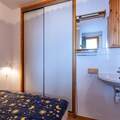Inside, the apartment is thoughtfully designed for comfort and convenience. The living room features a sofa bed and a television, creating a welcoming space to relax. Two bedrooms provide flexible sleeping arrangements, including a set of bunk beds and a double bed. The well-equipped kitchenette includes a ceramic hob, oven, microwave, dishwasher, refrigerator, coffee maker, kettle, and toaster, making it easy to prepare meals. A separate bathroom and toilet add to the practicality, while the ski locker and elevator ensure ease during your stay. Please note that this is a non-smoking apartment, and pets are not allowed.