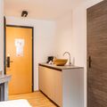 The suite has a coffee capsule machine, a kettle, a fridge, a toaster, plates, cups, glasses and cutlery.