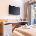 Living/bed room(double bed, TV, seating area), bathroom(shower, toilet, hairdryer), fitness room(shared with other guests)(fitness equipment), Internet access, boiling water tap, toaster, coffee machine, fridge, balcony or terrace, heating(central), parking, swimming pool(shared with other guests, heatable), lift