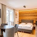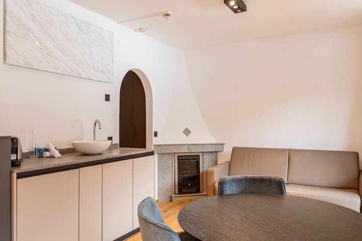 The charming Saalbach Suite offers a cozy and comfortable retreat for up to 4 people, featuring a living/dining room, a sleeping area, a modern bathroom, and a private balcony or terrace. The suite is equipped with thoughtful amenities, including a coffee capsule machine, kettle, fridge, sink, toaster, plates, cups, glasses, and cutlery, though cooking facilities are not available. The suite’s tasteful furnishings and access to an in-house wellness and fitness area ensure a relaxing and enjoyable stay in the heart of Salzburg Pinzgau.