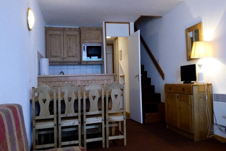High above the enchanting valley of Méribel Mottaret, this inviting alpine apartment offers a perfect blend of comfort, convenience, and breathtaking views. Imagine waking up to the crisp mountain air and stepping onto your private balcony to take in the serene beauty of the surrounding peaks. Located in the Laitelet district, the Arpasson residence places you directly on the slopes, making it an ideal choice for ski enthusiasts and nature lovers alike. Whether you're here to carve through pristine snow or explore scenic trails, this property ensures every moment is unforgettable. \n\nInside, the apartment is thoughtfully designed to accommodate up to nine guests. The living room features cozy sofa beds and a television, creating a warm space for relaxation after a day of adventure. The kitchen is fully equipped with modern appliances, including an electric hob, dishwasher, oven, microwave, and more, making it easy to prepare hearty meals. Upstairs, the mezzanine offers additional sleeping arrangements, while the attic bedroom provides a peaceful retreat. With separate bathrooms and a ski locker, every detail has been considered for your comfort. \n\nThe residence is conveniently situated near the Hameau shopping center, offering easy access to a mini-market, sports shops, restaurants, and bars. The Chalets cable car and free Méribus shuttles connect you effortlessly to the vibrant center of Méribel Mottaret, where you can enjoy après-ski activities and local charm. \n\nWhether you're seeking thrilling winter sports or tranquil summer hikes, this apartment is your gateway to the wonders of the French Alps. Book your stay and create memories that will last a lifetime.
