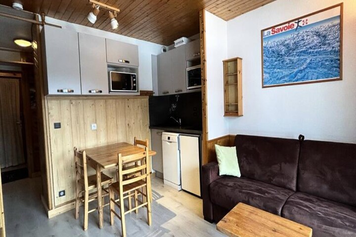 High above the shimmering waters of Lake Tueda and framed by the majestic Mont Vallon, this charming apartment in Méribel Mottaret offers a serene alpine retreat with direct access to the Aigle ski slope. Wake up to breathtaking views and the promise of adventure as you step out onto the balcony and breathe in the crisp mountain air. Whether you're here for winter sports or summer hikes, this residence is perfectly positioned to immerse you in the natural beauty of the French Alps. \n\nInside, the apartment combines comfort and practicality. The living room features a cozy sofa bed and a television, while a separate sleeping area includes bunk beds for added convenience. The kitchenette is fully equipped with modern appliances such as a ceramic hob, oven, microwave, dishwasher, and more, making it easy to prepare hearty meals after a day of exploration. The bathroom offers thoughtful touches like a towel dryer, and the separate toilet ensures privacy. Additional amenities include a ski locker, elevator access, and a balcony that invites you to unwind with stunning alpine views. Please note that pets are not allowed, and the apartment is non-smoking.\n\nThe residence, Les Plattières, is nestled in the Châtelet neighborhood, a newly developed area connected to Méribel Mottaret’s resort center and shops via a convenient funicular. With direct access to the ESF ski school meeting point, this location is ideal for families and ski enthusiasts alike. In the warmer months, the area transforms into a haven for hikers and nature lovers, with trails leading to Lake Tueda and beyond. \n\nWhether you're seeking thrilling ski runs, tranquil walks by the lake, or simply a cozy space to relax, this apartment offers the perfect base for an unforgettable alpine escape.