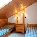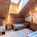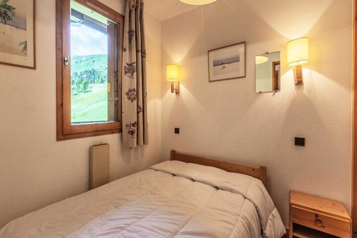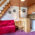 Perched above the serene Lake Tueda and framed by the majestic Mont Vallon, this charming alpine apartment in Méribel Mottaret offers a seamless blend of comfort and adventure. Imagine waking up to breathtaking views of snow-dusted peaks and stepping directly onto the Aigle slope for an effortless ski-in ski-out experience. Whether you're here for winter sports or summer hikes, this residence places you in the heart of the French Alps' natural beauty. The nearby ESF meeting point ensures easy access to ski lessons, while the funicular connects you to the resort center and shops for added convenience. \n\nInside, the apartment is thoughtfully designed for up to nine guests. The cozy living room features a single sofa bed, a comfortable sofa, and a television, creating a welcoming space to unwind after a day of alpine adventures. The kitchenette is fully equipped with modern appliances, including a ceramic hob, oven, microwave, dishwasher, and coffee maker, making meal preparation a breeze. Upstairs, the mezzanine boasts two attic bedrooms—one with three single beds and another with a double bed—alongside a shower room with a toilet. A separate bedroom with a double bed and a bathroom on the main floor ensures privacy and comfort for all guests. The balcony offers a tranquil spot to soak in the mountain views, while amenities like a ski locker and elevator enhance your stay. \n\nThe residence of Les Plattières is perfectly situated for exploring Méribel Mottaret's attractions. Beyond skiing, the area transforms into a summer paradise with hiking trails, vibrant alpine flora, and the shimmering Lake Tueda. Reserve a parking space for added ease and enjoy the convenience of nearby shops and dining options. Whether you're seeking thrilling slopes or peaceful moments in nature, this apartment is your gateway to unforgettable alpine memories.