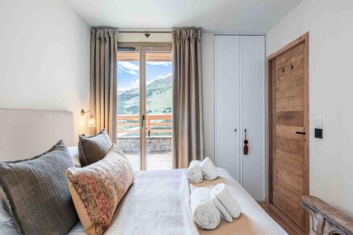 High above the enchanting valley of Méribel-Mottaret, this elegant alpine apartment offers a serene retreat for families and groups seeking the perfect balance of comfort and adventure. With breathtaking views of the Dent du Burgin and direct access to the slopes, your days begin with the crisp mountain air and end with unforgettable sunsets over the snowy peaks. Whether you're here to ski, explore, or simply relax, this property provides an idyllic setting for your alpine escape. \n\nInside, the apartment boasts a spacious living room that opens onto a large terrace, inviting you to soak in panoramic vistas while enjoying moments of tranquility. The open-plan kitchen is fully equipped with modern appliances, including a Nespresso machine, induction hob, and dishwasher, ensuring effortless meal preparation. Three cozy bedrooms with double beds, private balconies, and en-suite bathrooms promise restful nights, while a bunk bed alcove accommodates up to four children. Additional amenities such as WiFi, a ski locker, and covered parking add to the convenience of your stay. \n\nSituated in the peaceful Laitelet area, the apartment is perfectly positioned to access the slopes, ski school, and the charming center of Mottaret via the Chalets gondola lift. For nature enthusiasts, the nearby Vanoise National Park and Lake Tuéda offer opportunities for cross-country skiing and scenic walks amidst pristine landscapes. Méribel Centre is easily reachable by shuttle or the Truite ski run, providing access to vibrant après-ski options and local dining. \n\nWhether you're drawn to the thrill of the slopes or the serenity of alpine beauty, this apartment is your gateway to an unforgettable mountain holiday.