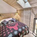 Designed for comfort and convenience, this 4-room duplex accommodates up to six guests. The living area features two cozy sofas, one of which converts into a bed, creating a warm and inviting space to unwind after a day on the slopes. The open-plan kitchen is fully equipped with modern appliances, including a Nespresso machine and dishwasher, making meal preparation a breeze. The bedrooms are thoughtfully arranged, with two single beds on the main floor and two additional bedrooms upstairs, one with a double bed and the other with twin beds under skylights, perfect for a restful night’s sleep.
