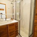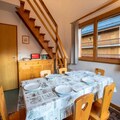 Spread across two levels, the apartment comfortably accommodates up to six guests. The ground floor features a bright and spacious living area with plush sofas, a wood-burning stove, and a dining table perfect for shared meals. The well-equipped kitchen includes modern appliances such as an oven, refrigerator, coffee maker, and dishwasher, ensuring you have everything you need. The sleeping arrangements are thoughtfully designed: two single beds in the first bedroom, a bunk bed in the second, and a double bed in the third. Upstairs, you'll find an additional bedroom with two single beds and a second bathroom with a bathtub. For added convenience, the residence includes an elevator and a ski locker.
