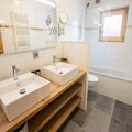 The apartment boasts a warm and inviting living space, complete with a cozy sofa, a large dining table for shared meals, and an open-plan kitchen equipped with everything you need, including a Nespresso machine, toaster, and dishwasher. With two bedrooms, one featuring a double bed and bunk beds, and another with bunk beds, it comfortably accommodates families or groups of up to six. The bathroom is thoughtfully designed with a bathtub, dual sinks, and a toilet, ensuring convenience and relaxation after a day in the mountains. Wi-Fi is included to keep you connected during your stay.