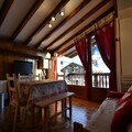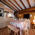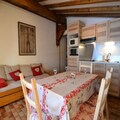 The apartment’s warm interior features exposed beams that exude rustic charm. The living room, equipped with a flat-screen TV and an open-plan kitchen, is perfect for gathering after a day of skiing. The kitchen is fully equipped with modern amenities, including ceramic hobs, a mini oven, a refrigerator, a microwave, and a dishwasher. The sleeping arrangements are thoughtfully designed, with a cozy double bedroom, an alcove with bunk beds, and a living room with a sofa bed and pull-out bed, ensuring comfort for all guests. Additional conveniences include a ski locker, private outdoor parking, and Wi-Fi with Orange TV. Pets are welcome, making it a perfect choice for families.