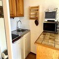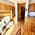 Inside, the studio is thoughtfully designed for comfort and functionality. The living room, adorned with warm mountain-style decor, features a television and a double sofa bed. The open-plan kitchen is equipped with essential appliances, including a mini-oven, microwave, and refrigerator, making it easy to prepare meals after a day on the slopes. An alcove with bunk beds adds to the sleeping arrangements, accommodating up to four guests. The bathroom includes a bathtub, and a separate toilet ensures convenience. Additional amenities such as a ski locker and unreserved outdoor parking enhance your stay.