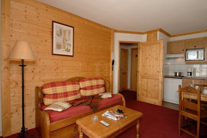 Escape to a cozy mountain retreat in the heart of Notre Dame de Bellecombe. This charming apartment, nestled in a traditional chalet-style complex, offers a warm and inviting interior with wooden accents and ample natural light. The open-plan living and dining area features a comfy sofa bed and satellite TV, while the fully equipped kitchen includes a ceramic cooker, combination microwave, dishwasher, and a spacious American fridge—perfect for preparing hearty post-ski meals.