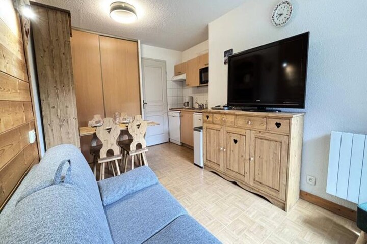 In the serene embrace of the French Alps, this charming apartment in the Les Chalets des Evettes residence offers a perfect retreat for mountain enthusiasts. With its prime location at the foot of the Espace Diamant ski slopes, you’ll wake up to breathtaking alpine views and the promise of adventure just steps from your door. Whether you’re seeking the thrill of skiing or the tranquility of mountain trails, this is your gateway to a world of natural beauty and outdoor activities. \n\nDesigned to comfortably accommodate up to four guests, the apartment features a cozy living room with an open-plan kitchen, equipped with modern appliances such as a microwave, dishwasher, and refrigerator. The living area opens onto a west-facing balcony, perfect for soaking in the sunset after a day of exploration. The sleeping arrangements include a bedroom with bunk beds and a sofa bed in the living room, ensuring restful nights for all. A bathroom with a bathtub and a separate toilet add to the convenience, while the mountain-inspired decor creates a warm and inviting atmosphere. \n\nBeyond the residence, the Espace Diamant ski area offers 192 km of slopes connecting six picturesque village resorts, catering to skiers of all levels. In summer, the region transforms into a haven for hikers and mountain bikers, with trails starting right from the residence. The nearby Evettes chairlift provides access to panoramic views of the Aravis mountain range, while the Flumet lake and leisure center, just 3 km away, offer family-friendly activities such as mini-golf, a skate park, and a climbing tower. \n\nWhether you’re exploring the elegant streets of Megève, marveling at Mont Blanc in Chamonix, or enjoying the crystal-clear waters of Lake Annecy, this apartment is your ideal base for unforgettable alpine adventures. With its heated indoor pool, convenient amenities, and proximity to nature, it promises a vacation filled with comfort, excitement, and cherished memories.