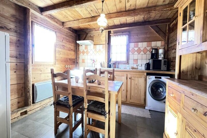 Amid the breathtaking alpine scenery of Notre Dame de Bellecombe, this charming Savoyard chalet offers a unique retreat for those seeking tranquility and adventure. Surrounded by majestic peaks and nestled just 500 meters from the Boulangère ski lift, it provides seamless access to the renowned Espace Diamant ski area, boasting 192 km of interconnected slopes. Whether you're here to carve through pristine snow or explore lush summer trails, this chalet is the perfect base for your mountain escape. The southwest-facing balcony invites you to soak in panoramic views of the surrounding peaks, including the iconic Mont Blanc, while enjoying the crisp alpine air. \n\nInside, the chalet blends traditional charm with modern comfort. The main level features a fully equipped kitchen that opens onto a cozy living and dining area, perfect for sharing meals and stories after a day of adventure. A double bedroom, a separate toilet, and a shower room complete the layout. Upstairs, accessed via a steep staircase, you'll find a second bedroom, two mezzanine spaces with single beds, and a workspace for those who need to stay connected. Thoughtful amenities such as WiFi, a washer/dryer, and private parking ensure a hassle-free stay. \n\nThe chalet’s location places you close to the vibrant village of Notre Dame de Bellecombe, just 5 km away, where you can explore local shops and restaurants. In summer, the Mont Rond chairlift offers access to stunning vistas, while nearby trails and Flumet lake promise endless outdoor activities. For winter sports enthusiasts, discounted ski passes and equipment storage make your holiday even more convenient. \n\nWhether you’re traveling as a family, a group of friends, or seeking a romantic getaway, this authentic chalet offers an unforgettable alpine experience. Let the beauty of Val d’Arly and the warmth of Savoyard hospitality create memories to cherish for a lifetime.