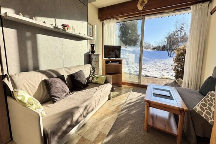 Amid the breathtaking landscapes of the French Alps, this charming studio apartment offers a cozy retreat for your next mountain getaway. Situated on the ground floor, the property is perfectly positioned for ski enthusiasts, with slopes like Teret, Quarts, and Reguet just steps away. Whether you're here to carve through fresh powder or enjoy the vibrant alpine atmosphere, this accommodation places you at the heart of it all. In summer, the lush surroundings transform into a haven for outdoor activities, with tennis courts and a refreshing outdoor pool available exclusively for guests. \n\nThe 25 m² studio is thoughtfully designed to maximize comfort and functionality. An alcove in the entrance features two bunk beds, while the open-plan kitchen and living area include a fold-down double bed, creating a versatile space for up to four guests. The bathroom is equipped with a separate toilet for added convenience. Guests can also enjoy the practicality of a ski locker and access to a spacious parking area right at the foot of the building. For those seeking additional amenities, a private enclosed garage is available for weekly rental within the residence. \n\nLocated just 50 meters from the ESF ski school and ski lift ticket offices, and 100 meters from the town center and shops, everything you need is within easy reach. In summer, explore the scenic trails, indulge in local cuisine, or simply unwind by the pool. The nearby attractions and facilities ensure a memorable stay, whether you're visiting during the snowy winter months or the sunlit summer season. \n\nWith its prime location, thoughtful amenities, and the majestic alpine backdrop, this studio is an ideal choice for couples, families, or small groups seeking both adventure and relaxation in the heart of the French Alps.