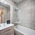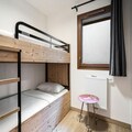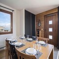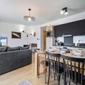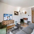 Designed with both style and comfort in mind, the apartment accommodates up to 8 guests, making it ideal for families or groups of friends. The thoughtfully arranged layout includes a cozy living room with a sofa bed, a fully equipped open-plan kitchen, and two spacious bedrooms—one with a double bed and another with twin beds. An additional sleeping alcove with bunk beds ensures everyone has their own space. Modern amenities such as a ski locker, enclosed garage, and luxurious bathrooms (one with a bathtub) enhance the convenience and relaxation of your stay.