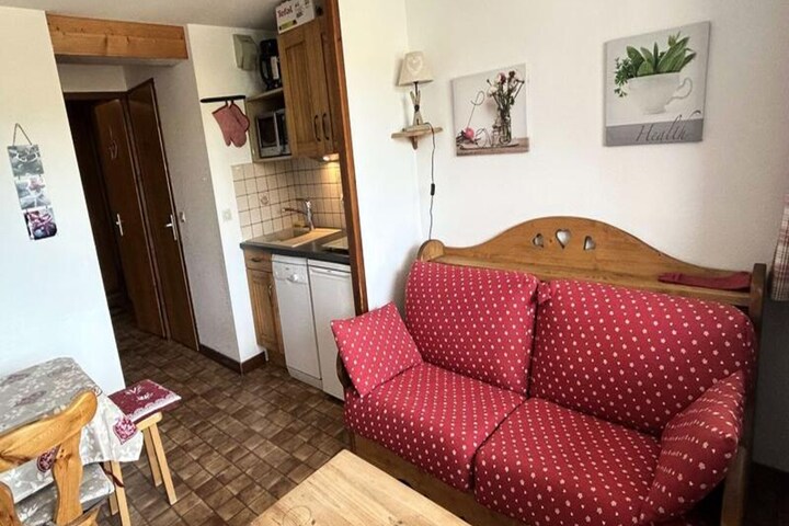 Basking in the golden glow of the French Alps, this charming studio apartment offers a cozy retreat with breathtaking views of Mont Bisanne. Situated on the second floor of a south-facing residence, it invites you to wake up to the serene beauty of the mountains and enjoy the convenience of being near the resort center and local shops. Whether you're visiting for a winter escape or a summer getaway, this property provides the perfect base for your alpine adventures. \n\nThe apartment is thoughtfully designed to maximize comfort and functionality. It features a fully equipped kitchenette, ideal for preparing hearty meals after a day of exploring. The living room includes a comfortable double sofa bed, while the alcove offers two bunk beds, making it suitable for families or small groups (please note, the upper bunk is not recommended for children under six). A modern shower room and separate toilet add to the convenience, and the private balcony is perfect for soaking in the mountain air and stunning vistas. \n\nLocated just a short stroll from the resort center, you'll have easy access to shops, restaurants, and other amenities. In winter, the area transforms into a snowy wonderland with ski slopes and lifts nearby, while summer brings opportunities for hiking, biking, and exploring the lush alpine landscapes. The residence's south-facing orientation ensures plenty of sunlight, creating a warm and inviting atmosphere year-round. \n\nWhether you're seeking thrilling outdoor activities or a peaceful retreat in nature, this studio apartment offers an unforgettable stay in the heart of the French Alps. Let the majestic Mont Bisanne be the backdrop to your perfect holiday.