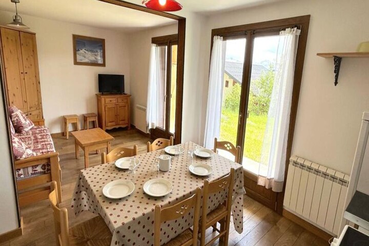 Perched at the top of the resort along Avenue des Cômes, this charming garden-level apartment offers a serene retreat with stunning south-facing views of Mont Bisanne and the majestic Beaufortain mountain range. Here, the beauty of the French Alps unfolds before you, creating a tranquil atmosphere perfect for unwinding after a day of adventure. The residence’s elevated position ensures a peaceful escape while still being close to the heart of the resort’s activities. \n\nInside, the apartment is thoughtfully designed to accommodate up to eight guests. The living room features a cozy double sofa bed, while the two bedrooms provide a mix of sleeping arrangements, including a double bed, two single beds, and a mezzanine double bed (not recommended for children under six). The kitchen is fully equipped for preparing meals to enjoy with loved ones, and the bathroom with a separate toilet ensures convenience for all. The south-facing orientation fills the space with natural light, creating a warm and inviting ambiance. \n\nThe location offers easy access to the resort’s amenities and activities. Whether you’re here to ski the pristine slopes in winter or explore the lush alpine trails in summer, you’ll find everything you need within reach. The breathtaking views of Mont Bisanne and the surrounding peaks provide a constant reminder of the natural beauty that surrounds you. \n\nChoose this residence for its blend of comfort, practicality, and unparalleled mountain vistas. Whether you’re seeking adventure or relaxation, this alpine retreat promises a memorable stay in the heart of the French Alps.