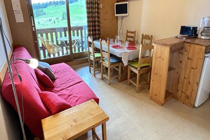 Bask in the serene beauty of the French Alps with this charming studio apartment, perfectly situated on the slopes and just a short distance from the resort center. Facing south, the residence offers breathtaking views of Mont Bisanne and the majestic Beaufortain mountain range, creating the perfect alpine retreat for nature lovers and adventure seekers alike. Imagine waking up to the golden hues of the sunrise over the mountains, ready to embrace a day of skiing, hiking, or simply soaking in the tranquil surroundings. \n\nThis cozy studio apartment, located on the second floor of the residence, provides all the comforts you need for a memorable stay. The living space includes a double sofa bed, a sleeping alcove with two bunk beds, and a separate sleeping cabin with additional bunk beds, making it ideal for families or small groups. The fully equipped kitchenette allows you to prepare hearty meals after a day of exploration, while the south-facing balcony invites you to unwind with a glass of wine as you take in the stunning alpine vistas. The bathroom features a separate toilet for added convenience, and the apartment is rated as a 2-star furnished tourist accommodation. \n\nStep outside, and you’ll find yourself directly on the slopes, offering unparalleled ski-in/ski-out access. The nearby resort center is brimming with amenities, including shops, restaurants, and après-ski options, ensuring you have everything you need within reach. In the warmer months, the area transforms into a haven for hikers and mountain bikers, with trails that wind through lush landscapes and offer panoramic views of the region. \n\nWhether you’re seeking thrilling outdoor adventures or a peaceful escape in the heart of the Alps, this studio apartment provides the perfect base for an unforgettable holiday. Let the charm of the Beaufortain mountains and the warmth of this cozy retreat create memories that will last a lifetime.