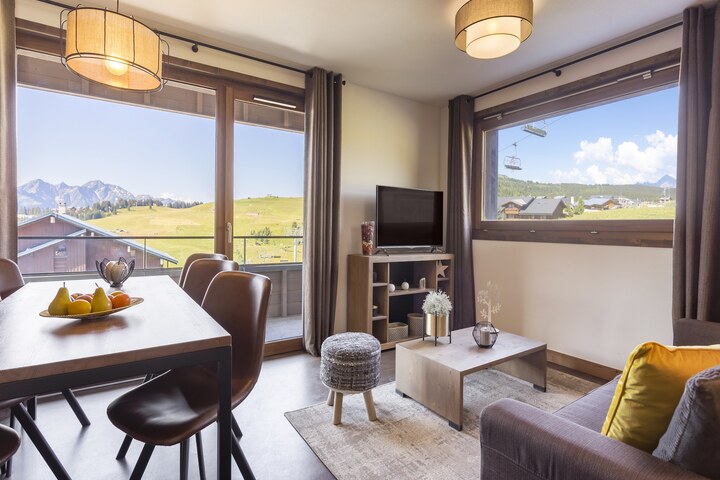 Welcome to Résidence Les Chalets des Cimes, where modern elegance meets authentic Alpine charm. Nestled in six stunning chalet buildings, our spacious 2-bedroom apartment is perfect for families, groups, and pet lovers. Enjoy warm wood interiors, high-quality furnishings, and thoughtful amenities such as a fully equipped kitchenette, three bathrooms, and a private balcony with breathtaking mountain views. Beds are made on arrival, Wi-Fi is included, and final cleaning is covered—your only task is to relax.
