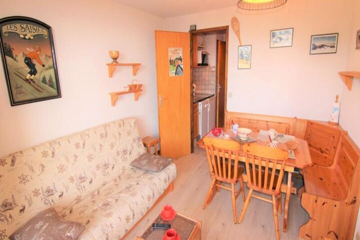 In the serene lower part of the resort, this charming studio apartment offers a cozy retreat for your alpine getaway. With its south-facing balcony, you can soak in the warm sunlight and enjoy the crisp mountain air, creating the perfect setting for relaxation after a day of adventure. The residence is conveniently located below the main avenue, just a short stroll from the Carrets chairlifts and the ESF ski school meeting points, ensuring easy access to the slopes and ski lessons for all levels. Nearby, a sports shop and mini-market provide everything you need for a comfortable stay. \n\nThe apartment, situated on the first floor of the residence (accessible via half a flight of stairs), is thoughtfully designed to maximize space and comfort. The living room features a 140cm sofa bed, seamlessly connected to an open-plan kitchenette equipped for preparing hearty meals. A cozy sleeping alcove includes two 80cm bunk beds and an additional 80cm pull-out bed, making it ideal for families or small groups. The bathroom and separate WC add convenience, while the south-facing balcony invites you to unwind with a view. Please note, the upper bunk is not suitable for children under 6 years old. \n\nThis 1-star classified tourist accommodation provides a simple yet welcoming base for exploring the breathtaking surroundings. Whether you’re here to ski, hike, or simply relax, the location ensures you’re never far from the action. The proximity to the Carrets chairlifts and ESF ski school makes it an excellent choice for both beginners and seasoned skiers alike. \n\nWith its blend of practicality and charm, this studio apartment is a delightful choice for those seeking an affordable and convenient alpine escape. Let the beauty of the mountains and the convenience of this location create unforgettable memories for your next holiday.